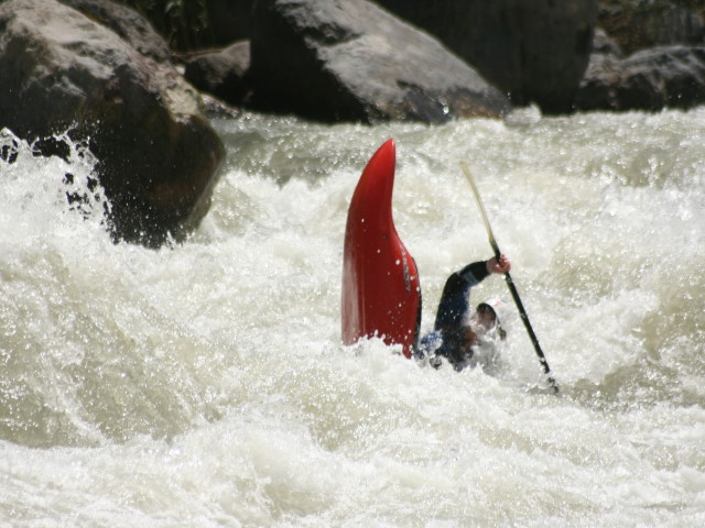 A boat pinned midstream provided us with an hours worth of white water safety and rescue and could have been featured in any text book on the subject, with ropes, karabiners, slings, live baits, pulls in all directions, vectors and no knots all being used to successfully reunite boat and paddler to continue downstream.