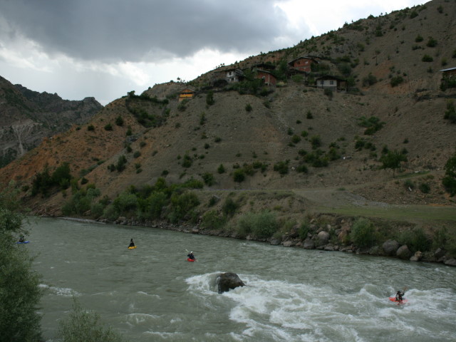Wednesday, we elected to paddle from the campsite, starting on the Barhal passing through the centre of Yusufeli before being spat out onto the Coruh for the main event, the 9 kilometre gorge section. Roadside throughout we had inspected the main rapids from on high the day before on our travels to the Tortum.