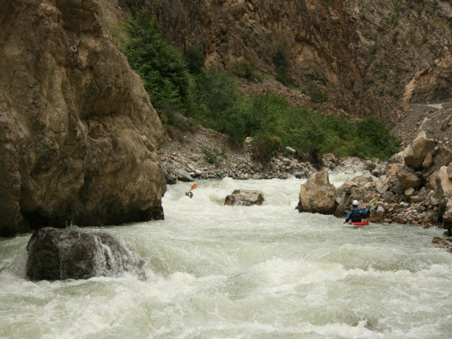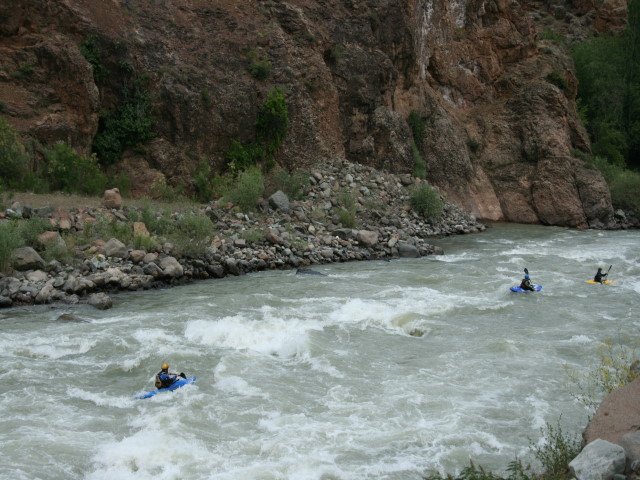 We put on as the river exits the gorge, a spectacular backdrop with sheer canyon walls rising a couple of hundred feet then opening out providing you with views of peaks and countryside. That's if you have time to look. The river takes off at an alarming pace and just keeps going, throwing the full armoury of features at you in the first kilometre and not relenting until it spills itself into the Oltu, another tributary of the Coruh.