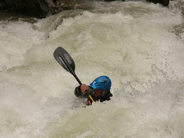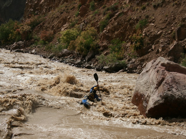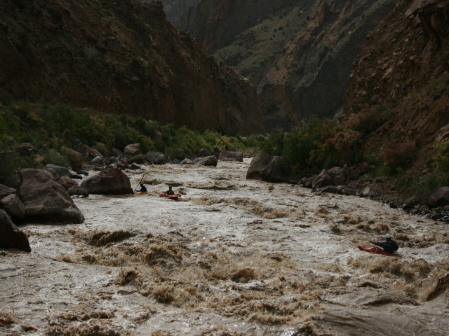 There is no white water, no way of seeing the features you would expect to be warned of by white foam as the water breaks unevenly over the obstacle that creates it. The brown water splashes into my eyes making them sting, the combination of water and fine grinding paste it contains irritate my contact lenses, the silt makes the paddle shaft slippy and I am forced to hang on tightly to the shaft to make the strokes I need. This is one of the hardest leads I have done on a river.