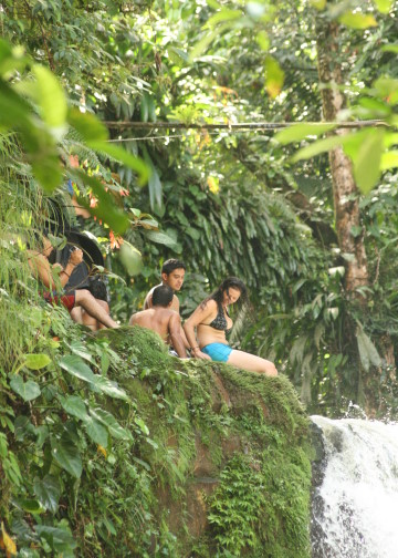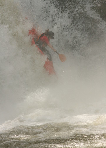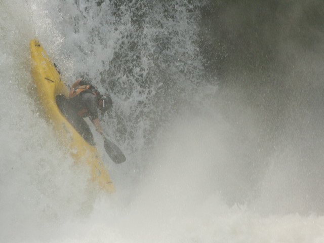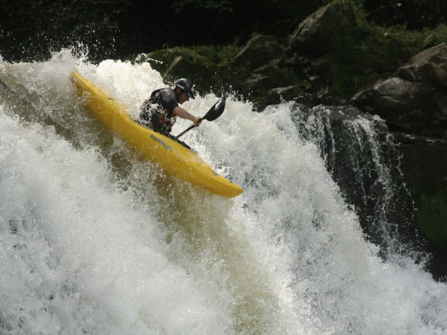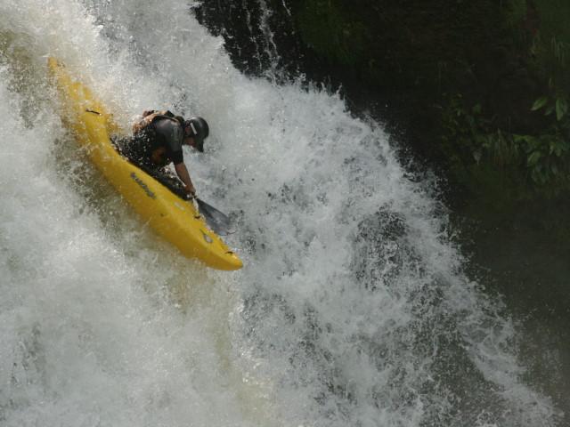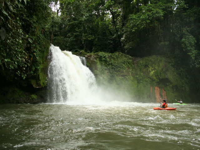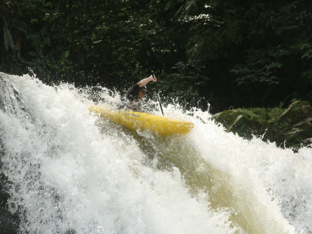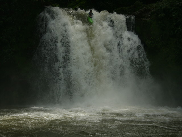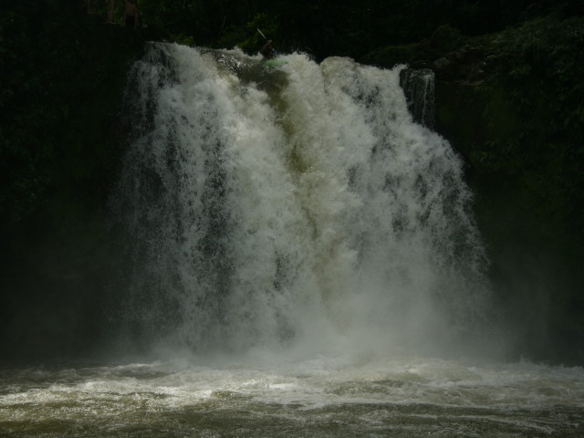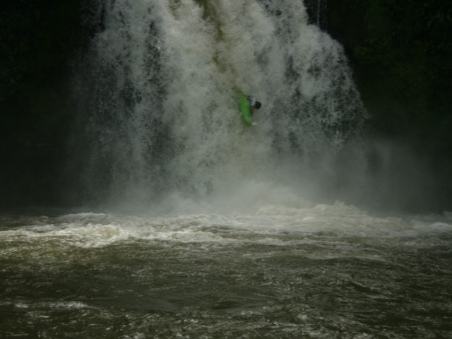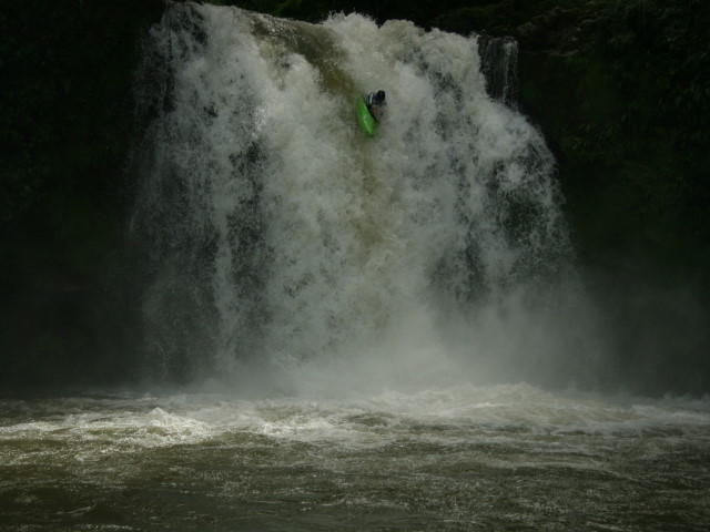 Luckily Juan Carlos also took some pictures of us falling off the Catarata Poza Azul, the blue pool waterfall! The Poza Azul is a trib of the Lower Sarapiqui. We hooked up with a local who showed us how to get to the fall through the forest. Parking the car at the local farm, paying 5,000 colones, thats around a fiver, give or take, for parking and security fees.Booked at 27 feet the fall is as straight forward flat to flat drop as you are likely to find, although according to the Chasing Jaguars guidebook, it has a reputation for hurting people, we were about to find out………….Walking in for 15 minutes to the base of the falls, it looked good to go, we took the boats to the top, lowering them down on ropes to a narrow ledge river right, just above the lip of the falls. Clipping the boats to a convenient tree we all looked at the lip of the fall and saw our line, keeping an obvious rooster to our left would see us on the green tongue projecting us out furthest from the base of the fall.Sliding in, a couple of upstream strokes, turning and set the line, before tucking and ducking and freefall.