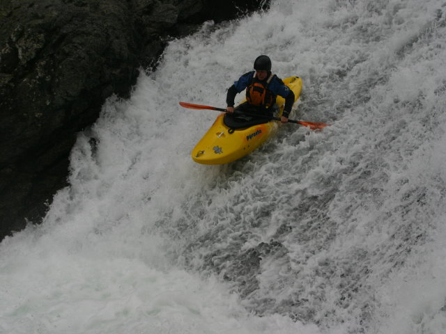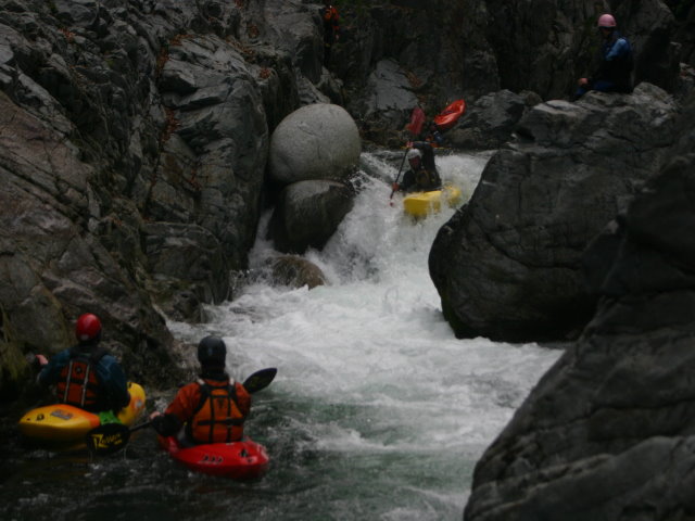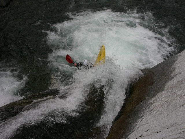 Driller dropping the last slide before the get out on river right, at these levels there was no stopper at the bottom of this slide but we heard of people getting some down time at higher levels.