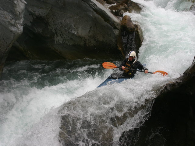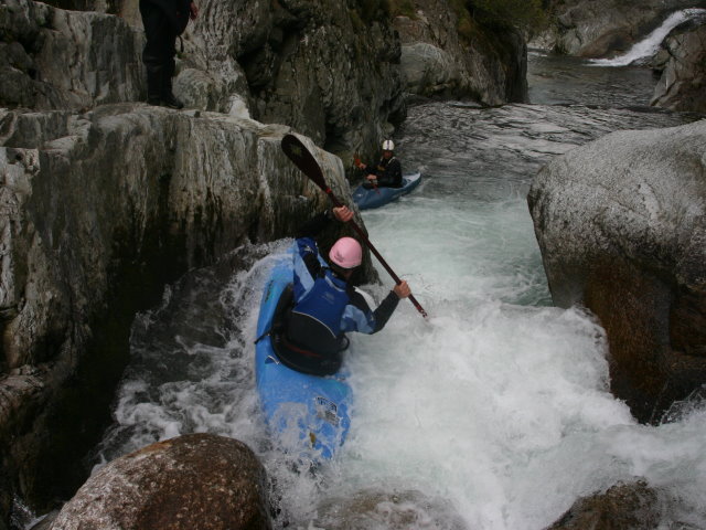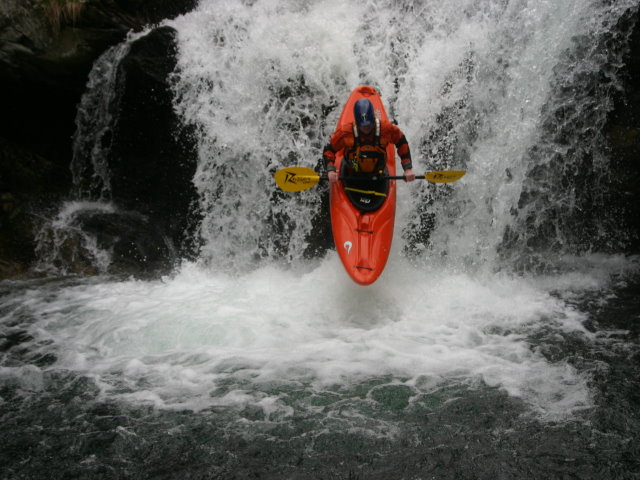 A 2K run that lies high up the valley above Rimasco, it took us 4 hours on our first run down, we inspected everything even at these low levels, the entry slide n drop is nowhere near as intimidating as it first appear and provides an opportunity to throw hammer's at will. From here the river drops steeply in a series of ledges and chutes to the other notable drop, being demonstrated by X Pres and Driller. For most of its path it follows the road down the valley.