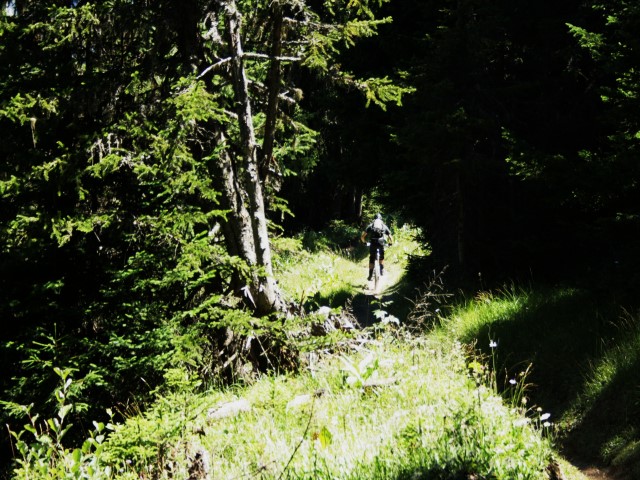 As we head into the trees, the trail just gets faster, off the brakes, on the brakes, its the forest moon of Endor, blasting through the trees, alternate switchbacks, pedalling hard, arms pumped, shoulders dropping in, looking ahead, later and later on the brakes, how long does this go on, more, more, more and then the inevitable happens, I feel the front break away, too much brake and the tyre looses grip, tucks under and its hello to air time, the bike remains mid track as I take my ticket to somewhere down the hill, the gradient eases the thud and I roll through the undergrowth, a quick dust down and head back to get the bike out of the way of the next rider, a quick survey of man and machine reveals only wounded pride on both parts! that was fun.