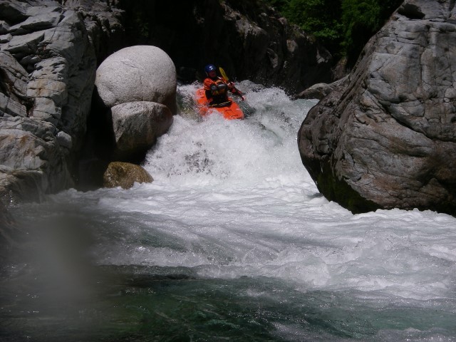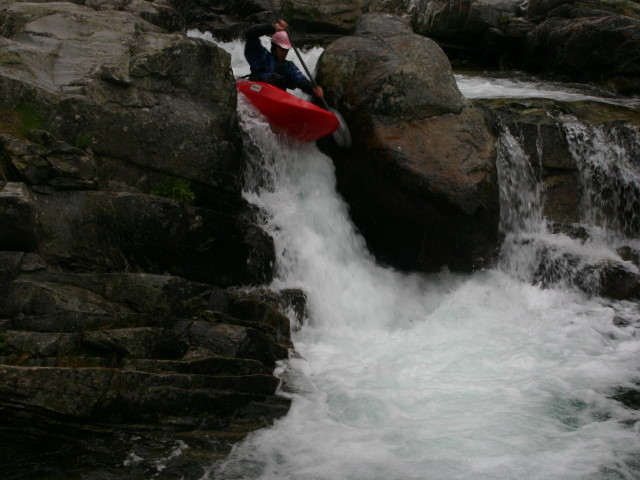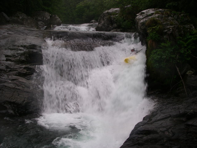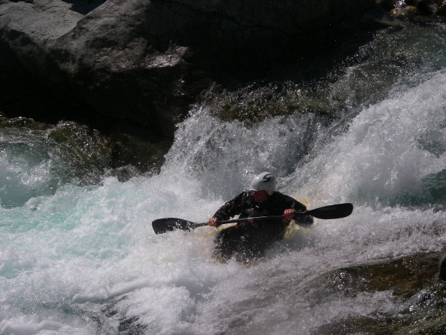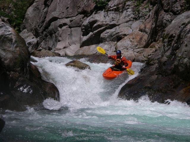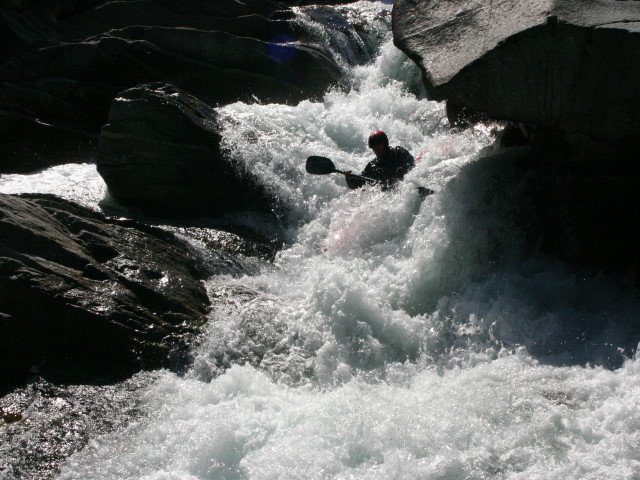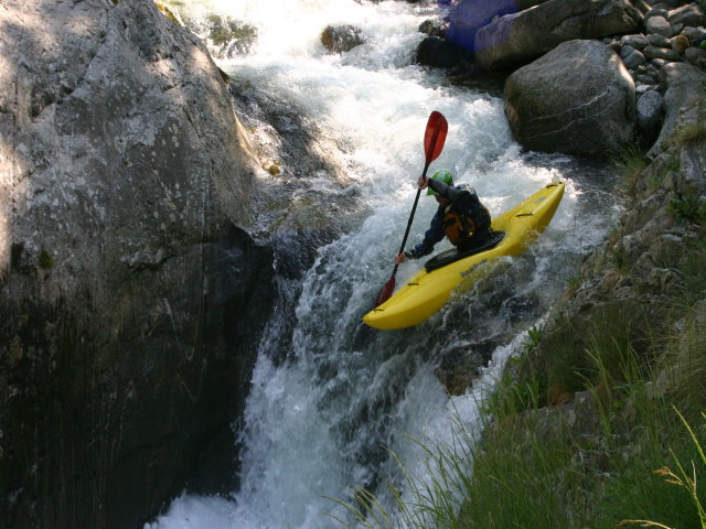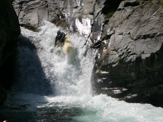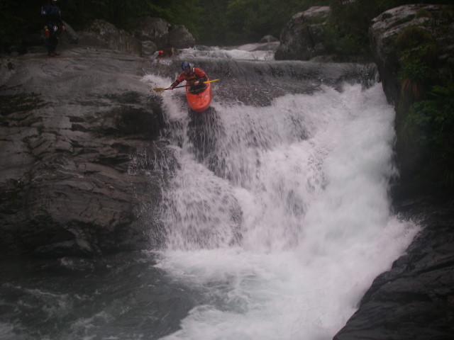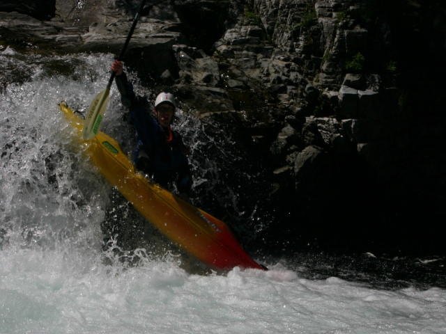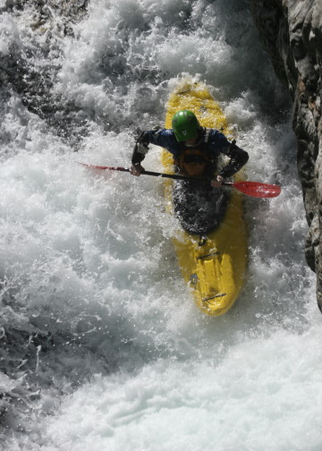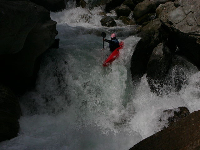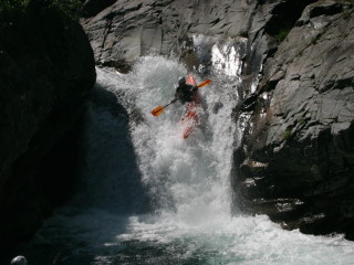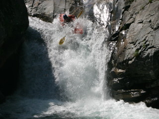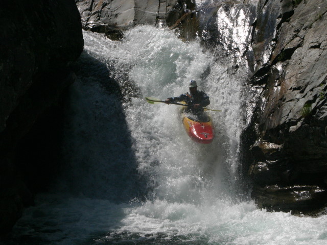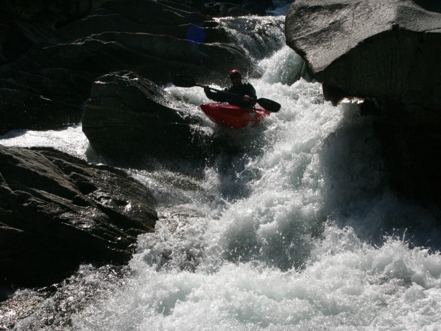 The last drop on the Middle Sermenza is a narrow chute on the far river left, steep as and with no chance of a boof in the tight channel the hole at its base was huge and nasty, we portaged, Doom logged some air time with this seal launch, it is way way higher than it looks!