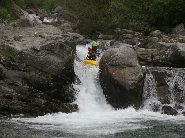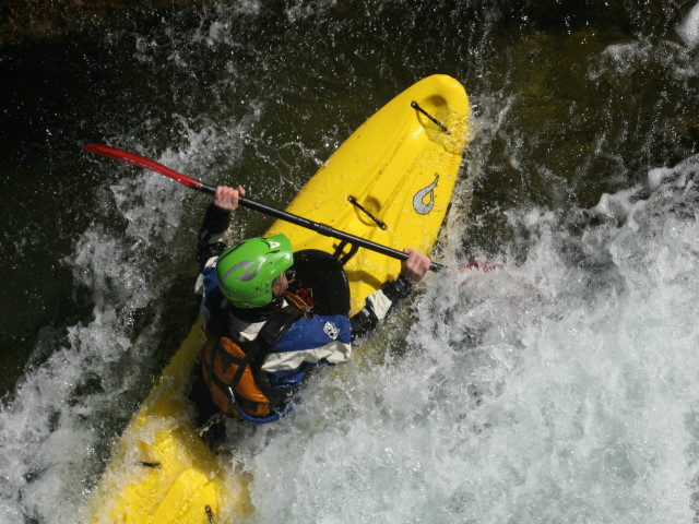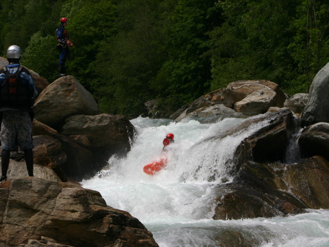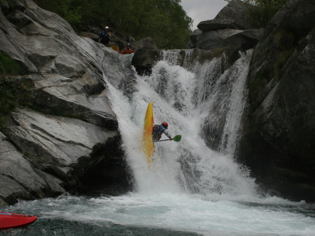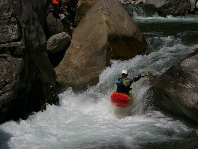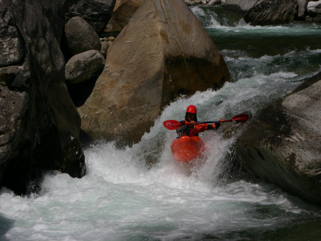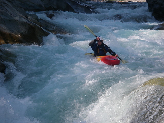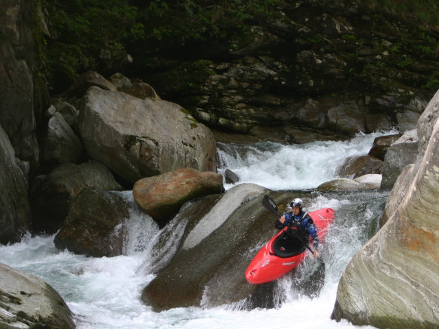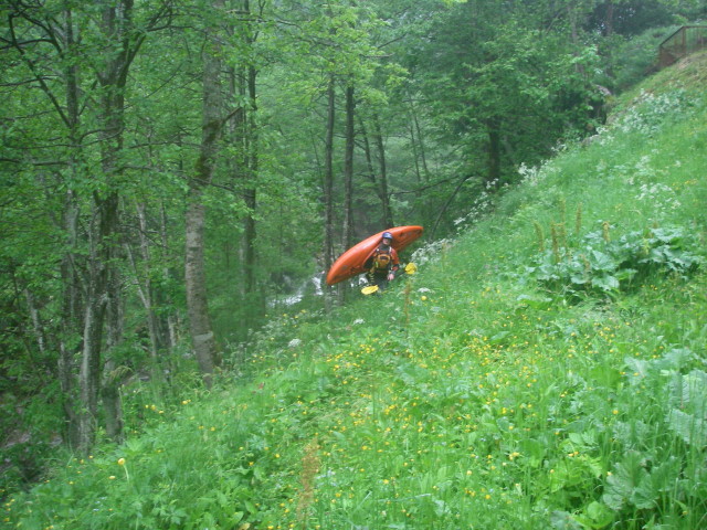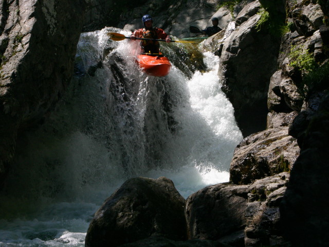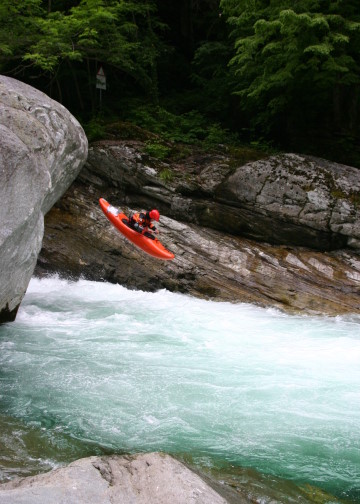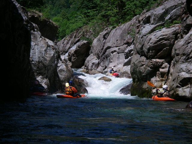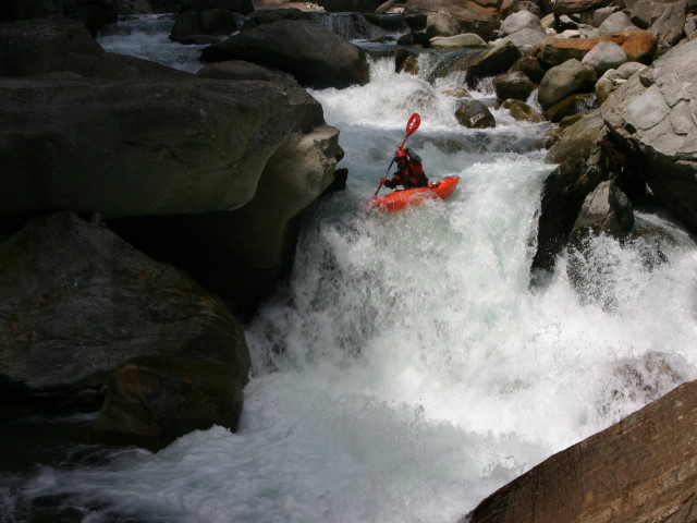 The last drop on the Middle Sermenza is a narrow chute on the far river left, steep as and with no chance of a boof in the tight channel the hole at its base was huge and nasty, we portaged, Doom logged some air time with this seal launch, it is way way higher than it looks!